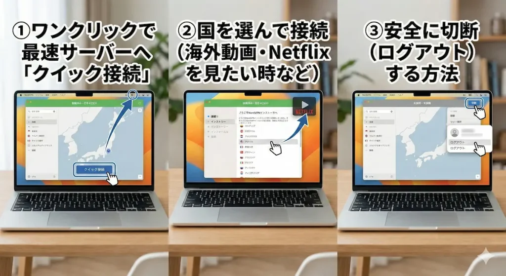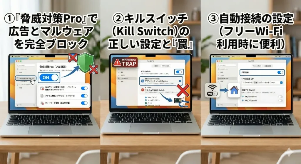 基本的な使い方をマスターしたら、NordVPNのポテンシャルを120%引き出すための「応用設定」を行いましょう。MacBookをカフェや出張先でバリバリ使うノマドワーカーの方は、以下の設定をしておくだけで安全性と快適性が激変します。