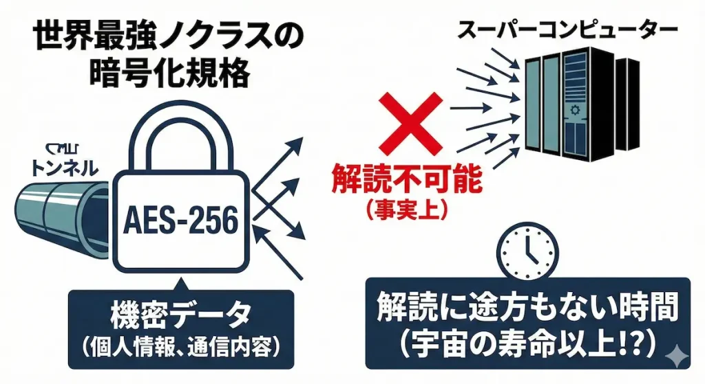 AES-256は、現在世界で最も強力とされている暗号化規格の一つです。アメリカ政府や軍隊、金融機関でも機密情報の保護に採用されています。