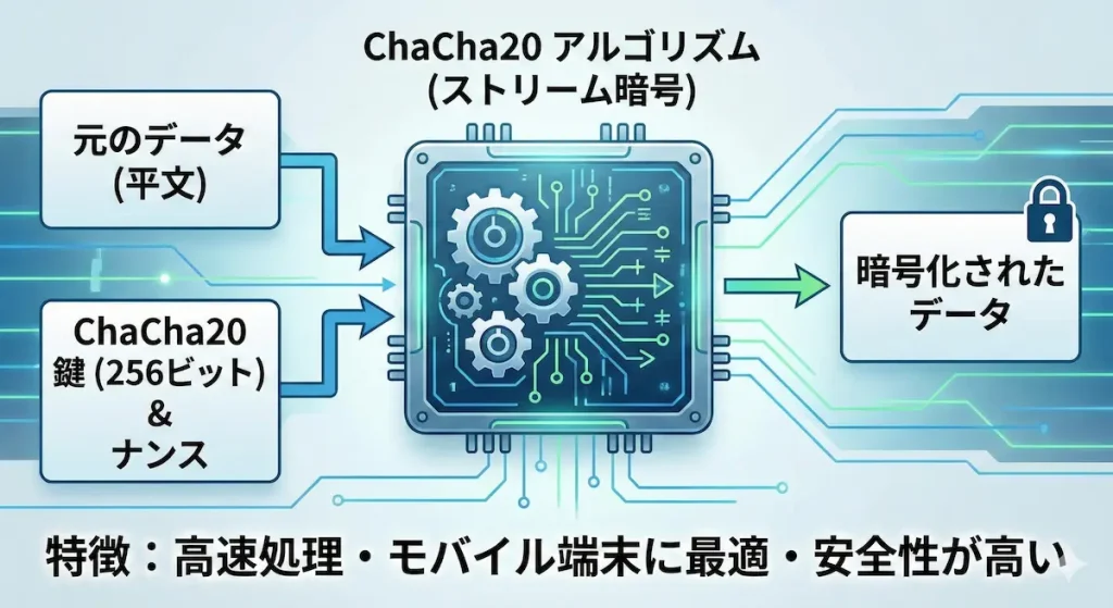 ChaCha20は、近年注目されている非常に高速な暗号化アルゴリズムです。AESをサポートしていない古い端末でも、スムーズに処理を実行できます。