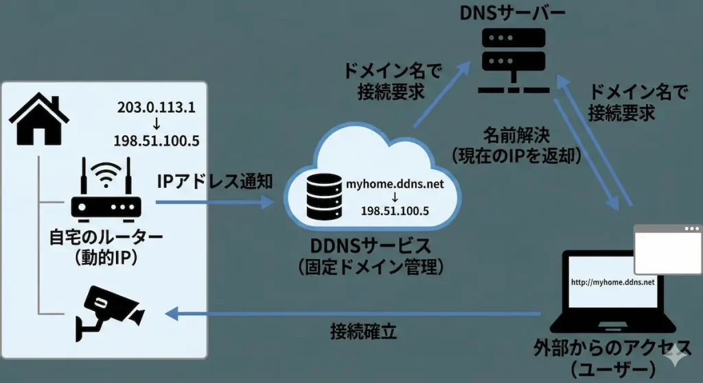 ダイナミックDNSは、変動するIPアドレスに固定のドメイン名を自動的に結びつける仕組みです。一般的な家庭用インターネット回線では、IPアドレスが定期的に変わります。