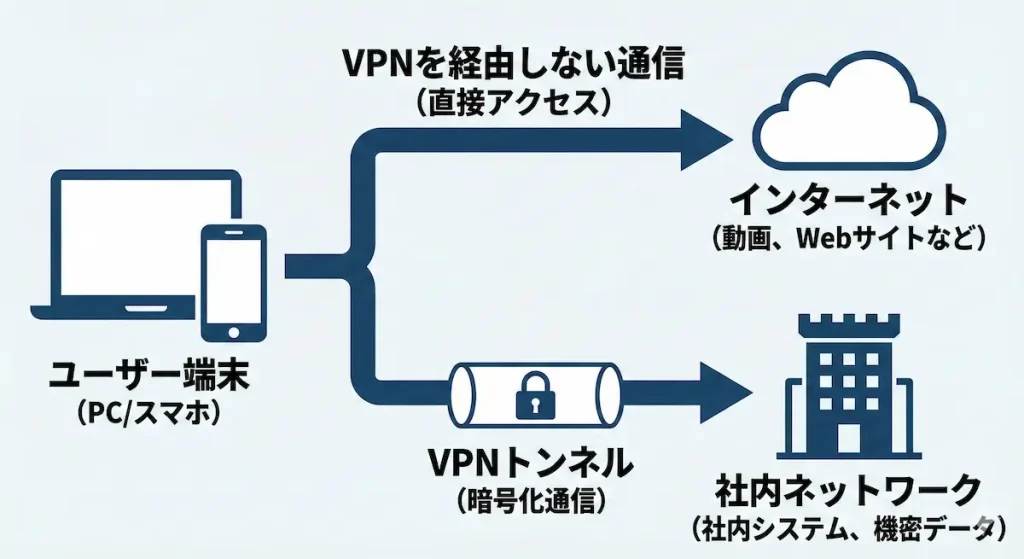 スプリットトンネリングは、VPNを通す通信と通さない通信をアプリごとに分ける機能です。すべての通信をVPN経由にすると、通信速度が低下する場合があります。