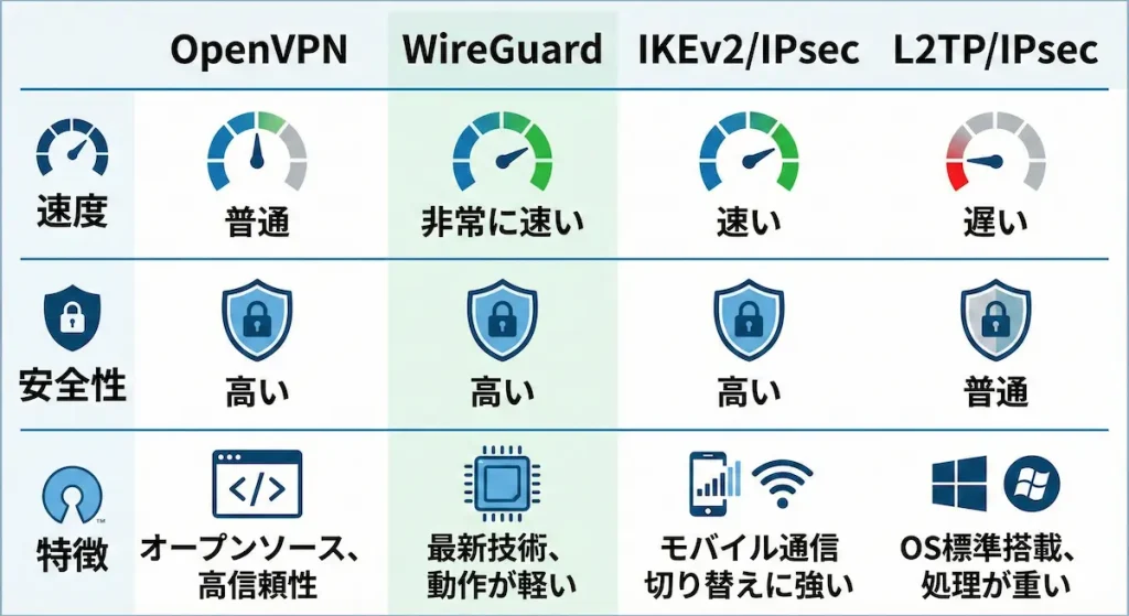 | WireGuard | 非常に速い | 高い | 最新技術で動作が軽い |