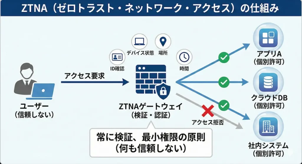 ZTNA(ゼロトラスト・ネットワーク・アクセス)は、「何も信頼しない」という前提に基づき、アクセス要求のたびに認証を行うセキュリティモデルです。従来のVPNは一度ネットワーク内に入ると自由に移動できる弱点がありました。